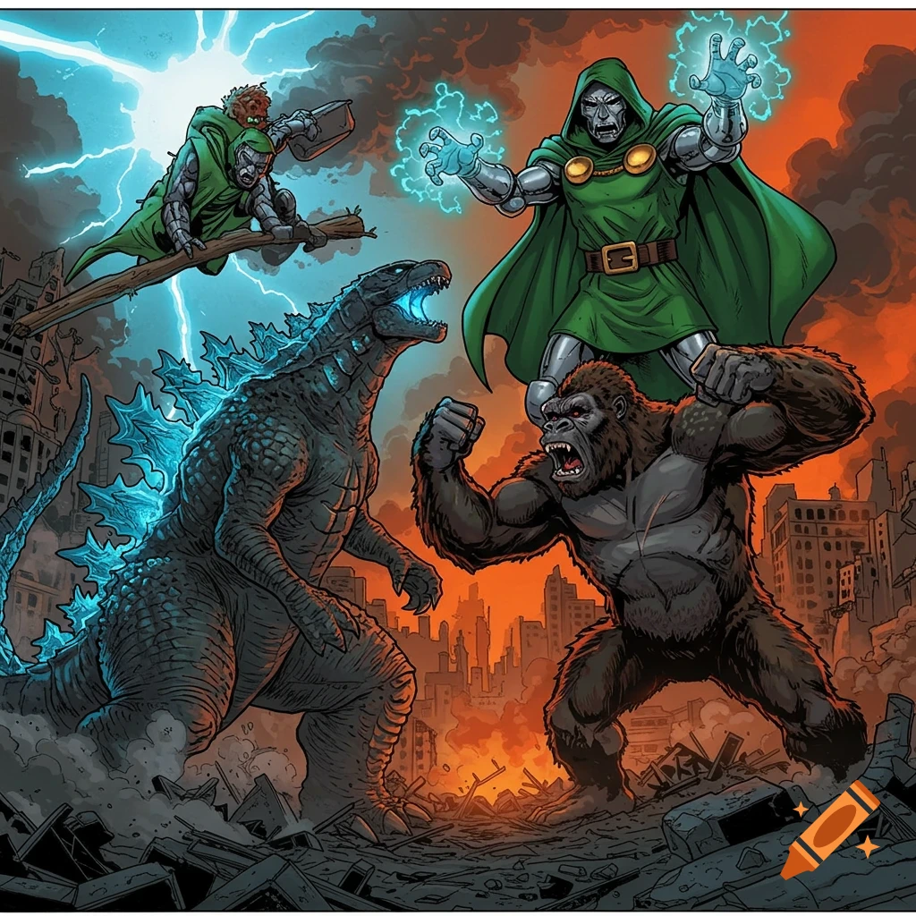 Comic illustration of Godzilla King Kong and Dr Doom battling in a