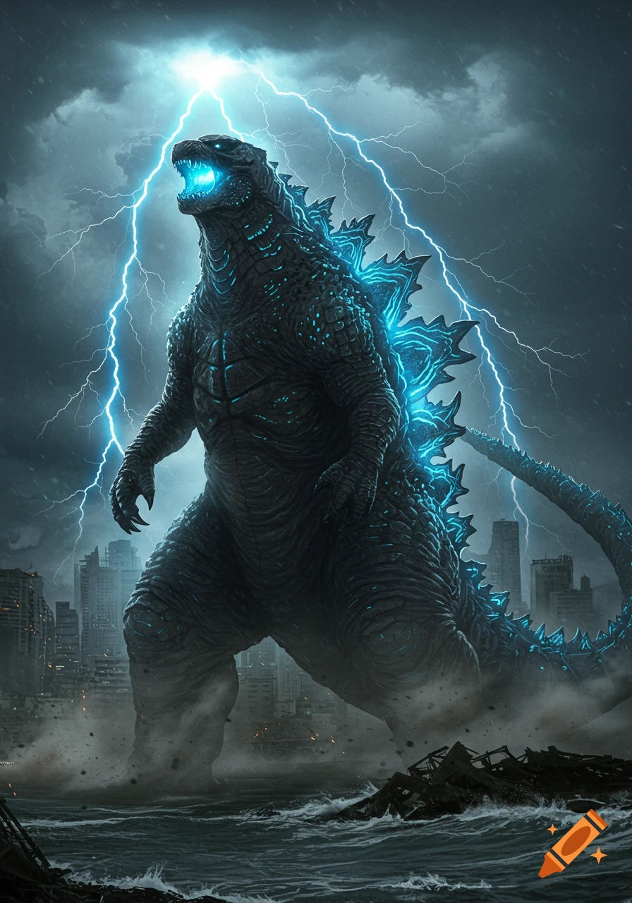 A giant Godzilla with glowing blue spines roars amidst a lightning