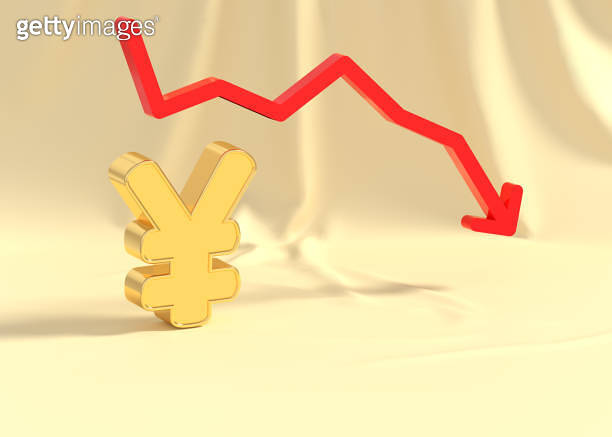 Japanese monetary unit Yen with red arrow 3D rendering in golden