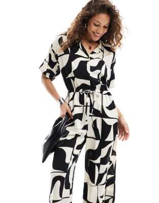 Monki tie waist jumpsuit in black and white puzzle print ASOS