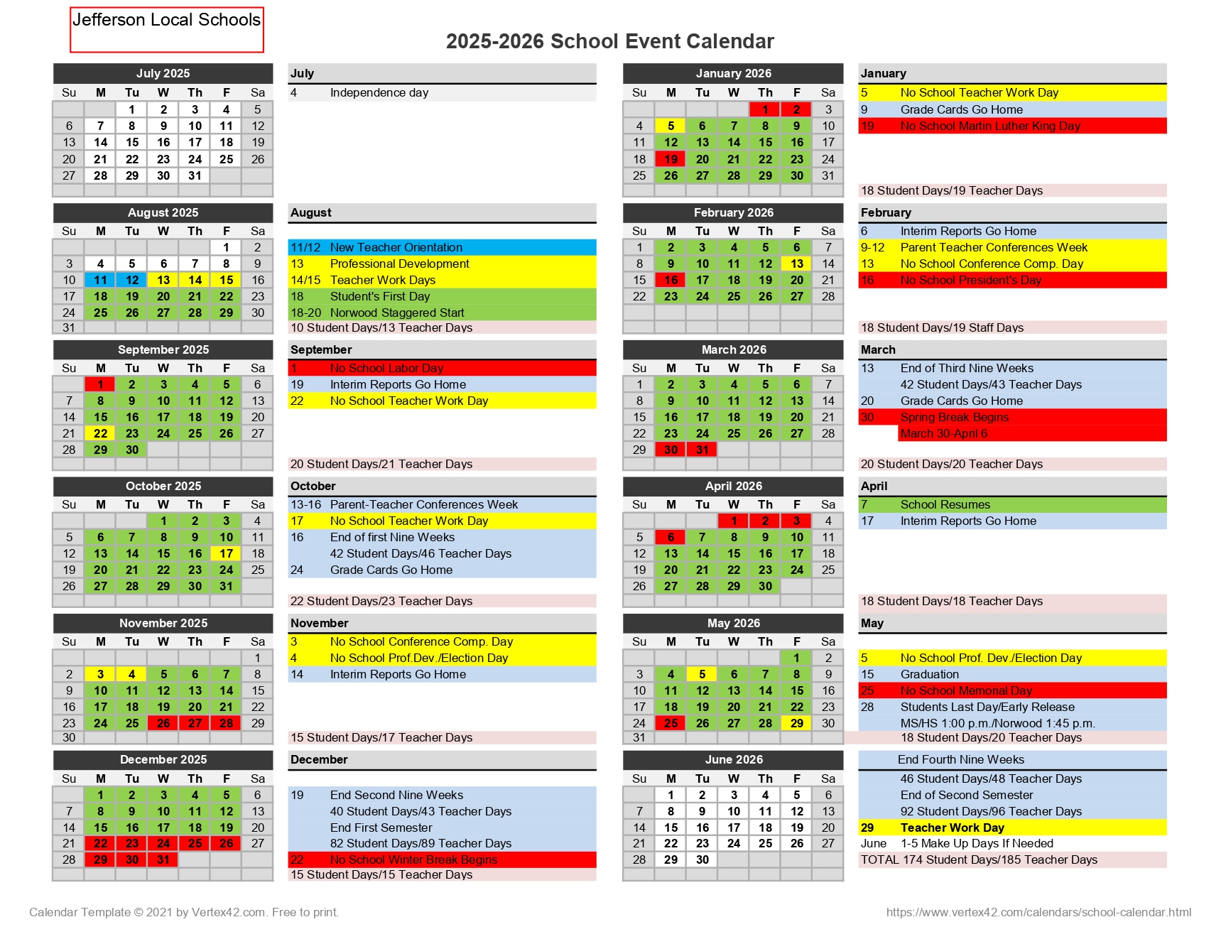 Jefferson Township Local School Calendar