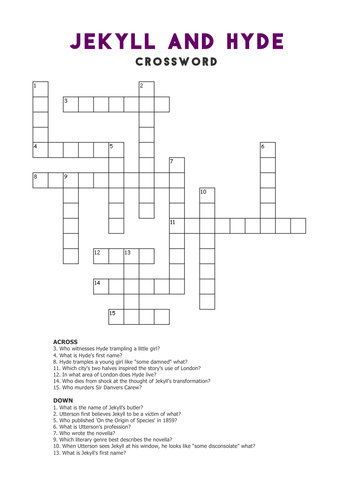 Dr Jekyll and Mr Hyde Crossword Puzzle by Ivory Butler TPT