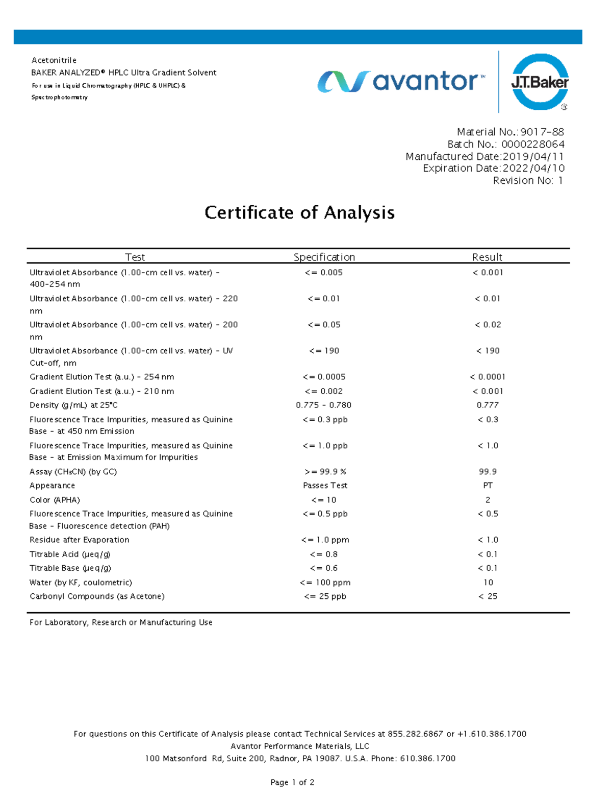 Jt Baker Certificate Of Analysis