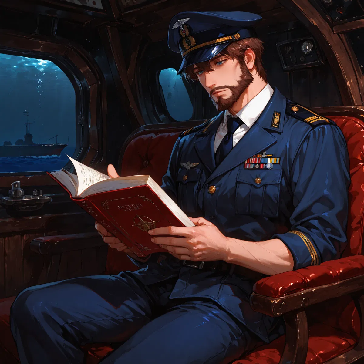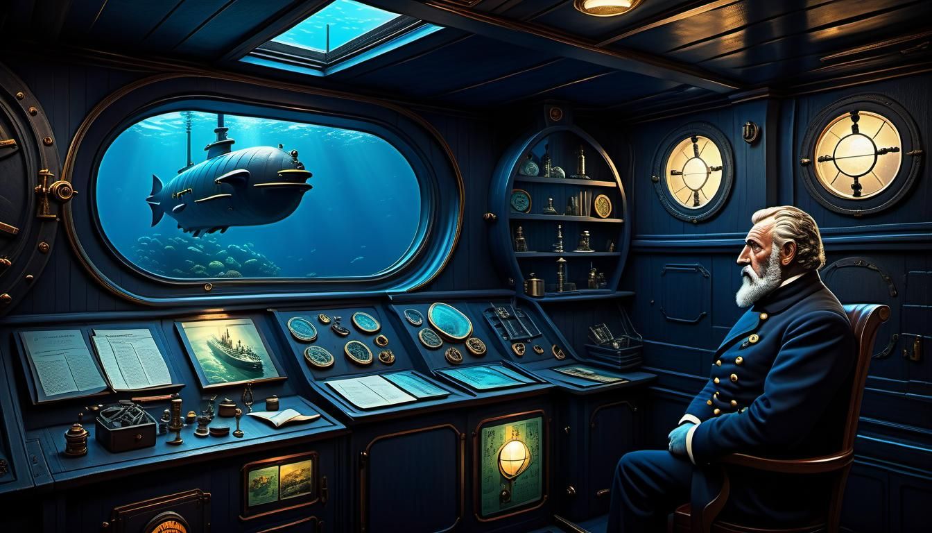 naval captain in the main cabin of a jules verne/captain nemo/nautilus