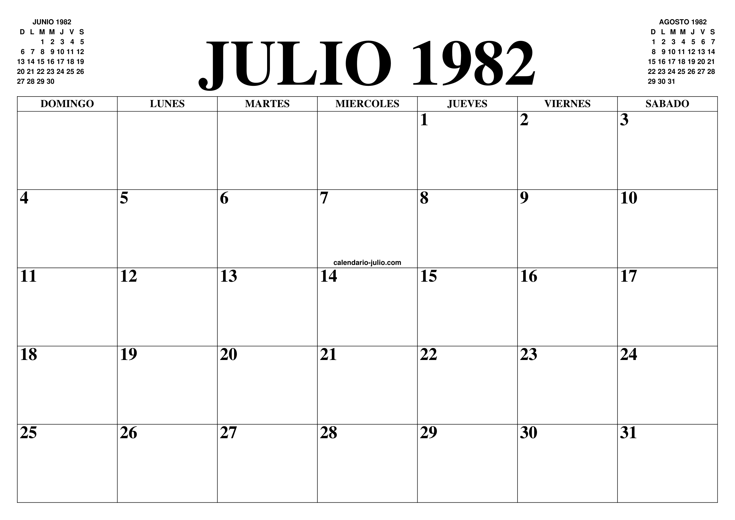 CALENDARIO JULIO 1982 : EL CALENDARIO JULIO PARA IMPRIMIR GRATIS MES