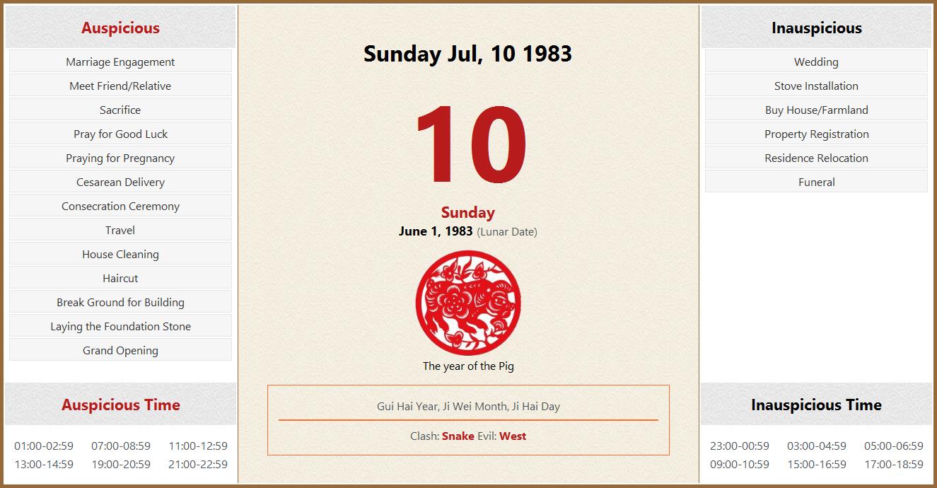 July 10 1983 Almanac Calendar: Auspicious/Inauspicious Events and Time