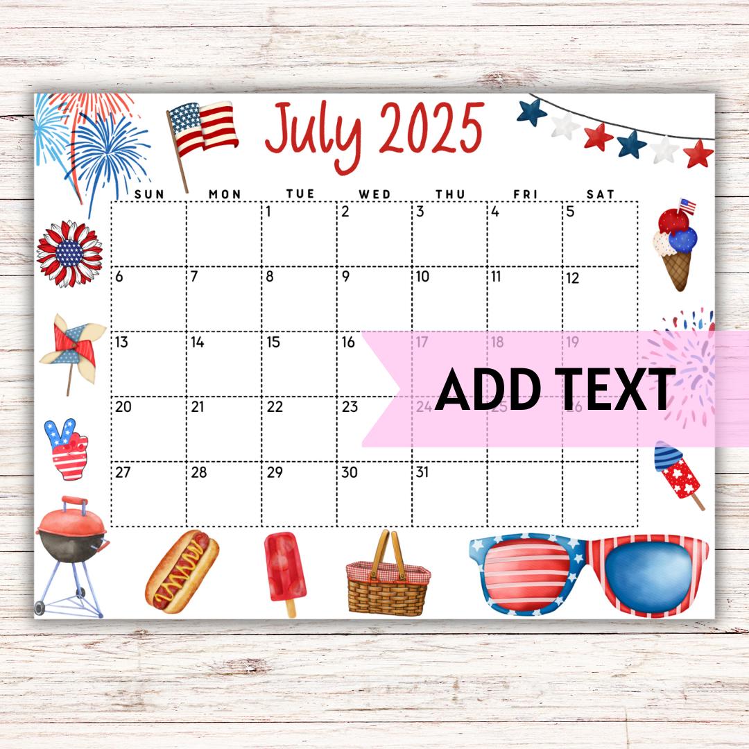 EDITABLE Printable July Calendar 2025 Cute 4th of July Calendar W