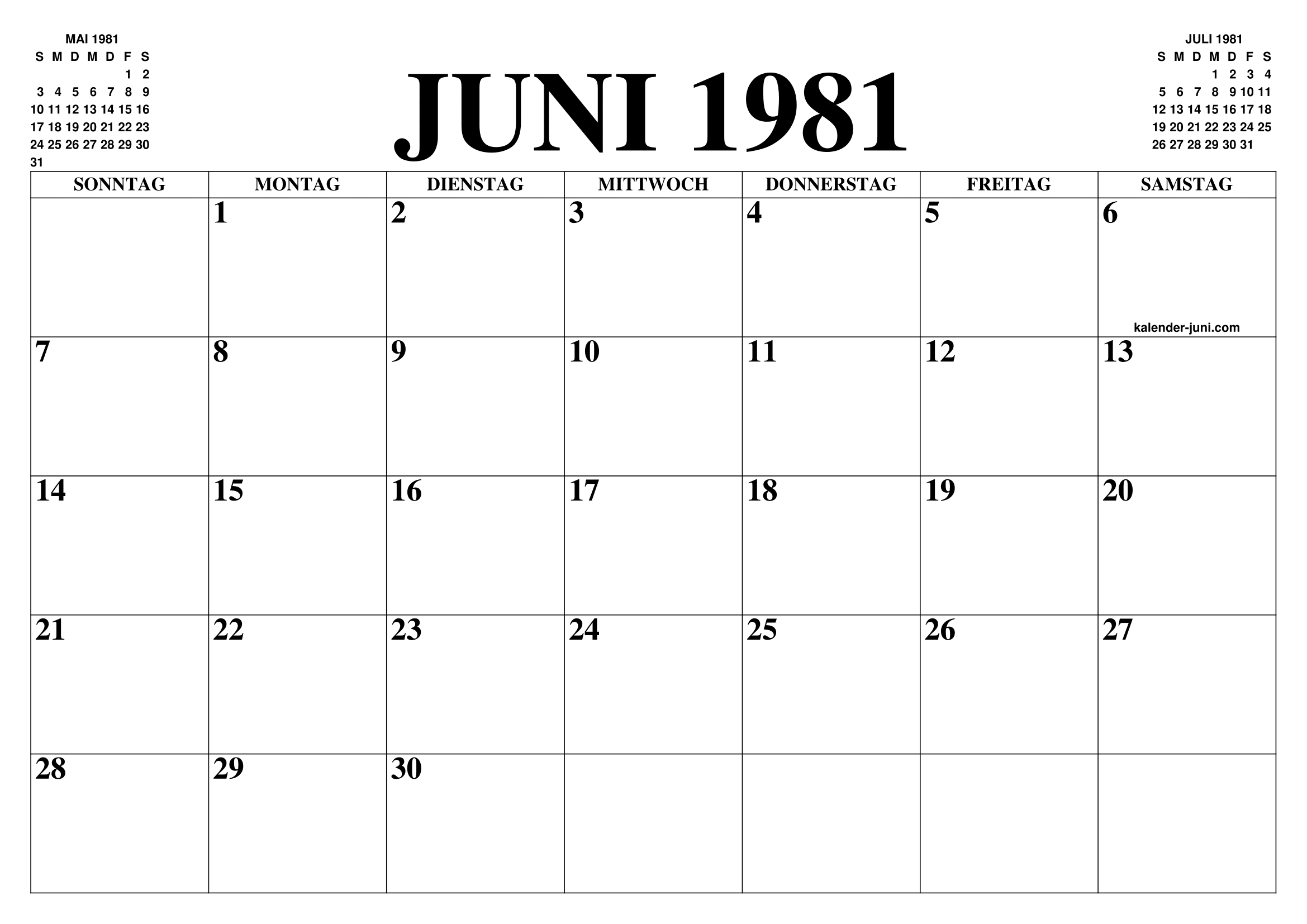 KALENDER JUNI 1981 : JUNI KALENDER ZUM AUSDRUCKEN GRATIS MONAT UND JAHR