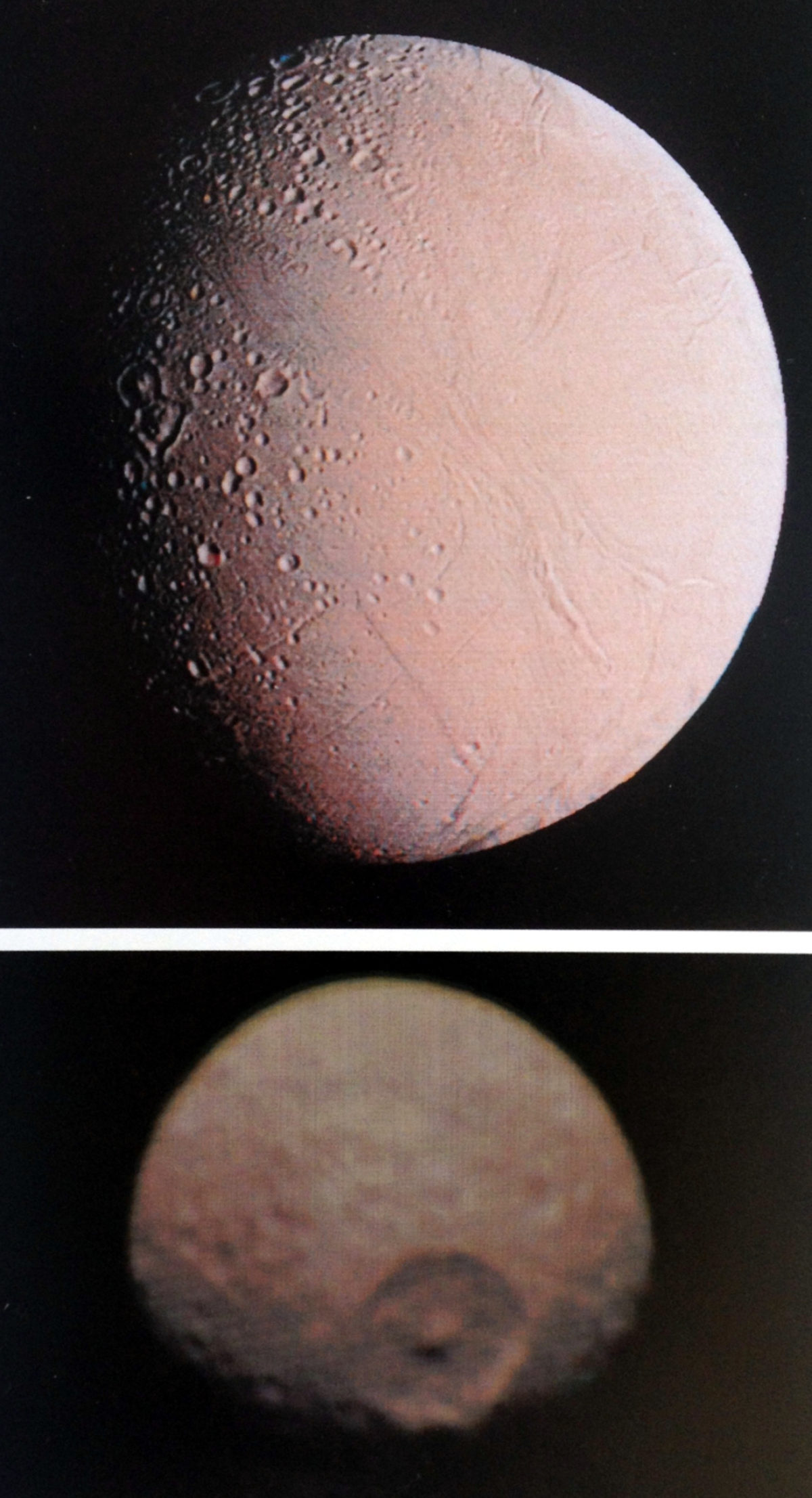 Enceladus and Mimas views from 1997 NASA book The Planetary Society