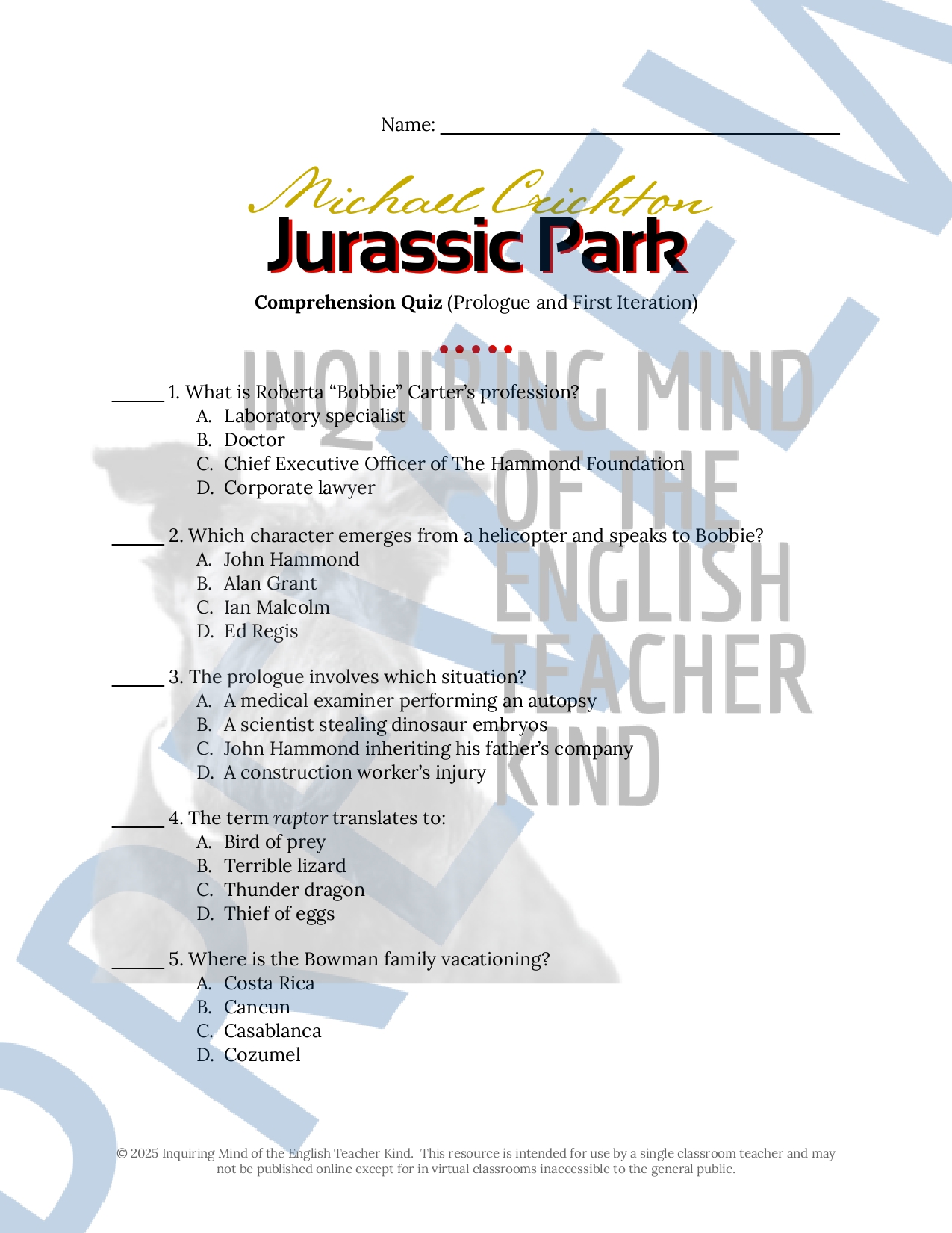 Jurassic Park by Michael Crichton Third Iteration Quiz and Answer Key i