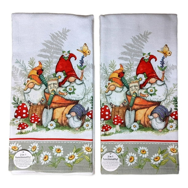 Set of 2 GARDEN GNOME Daisy Border Terry Kitchen Towels by Kay Dee