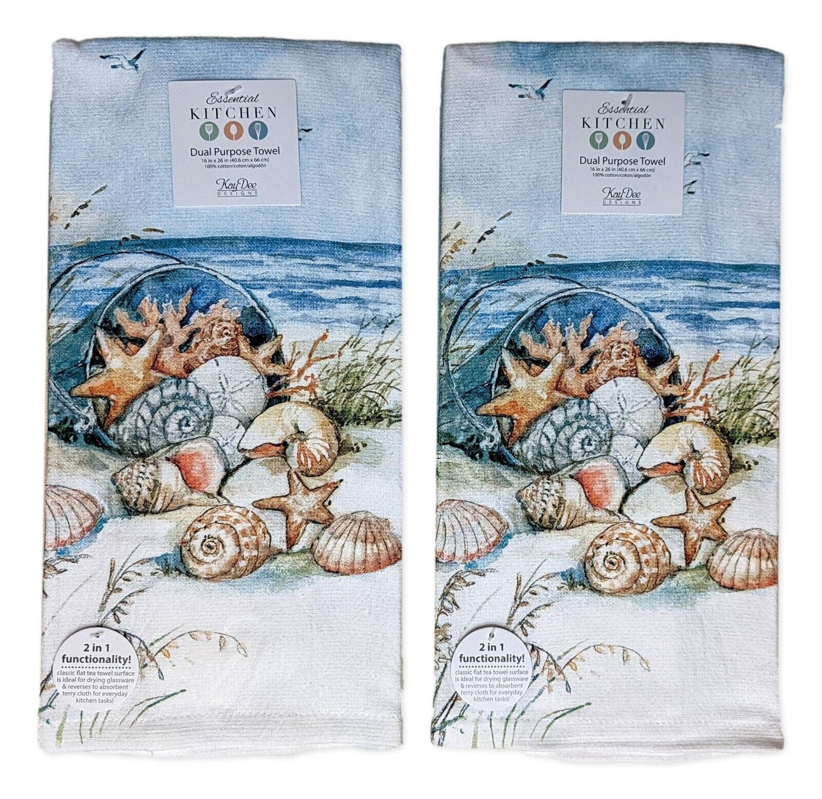 Set of 2 COASTAL SANCTUARY Sea Shell Toss Terry Kitchen Towels Kay Dee