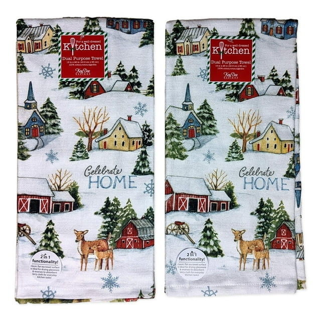Set of 2 HOME FOR CHRISTMAS Village Terry Kitchen Towels by Kay Dee