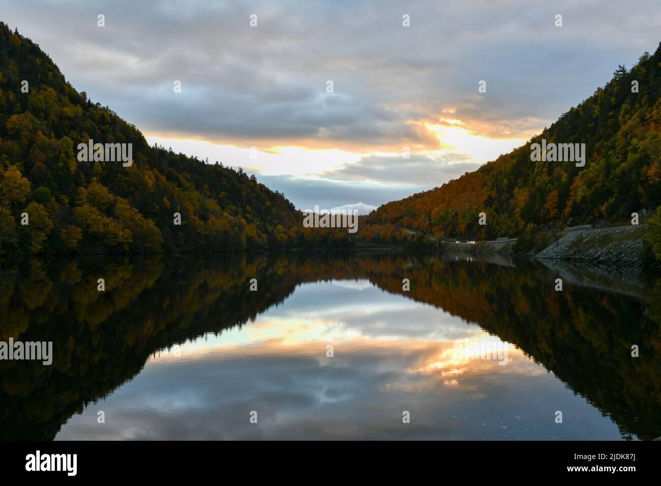 Peak fall foliage in Keene New York by Cascade Lake at sunset Stock