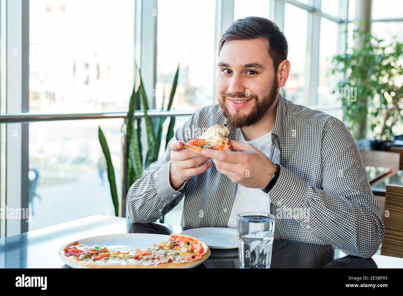 Happy smiling caucasian man eating Italian pizza in pizzeria keeps