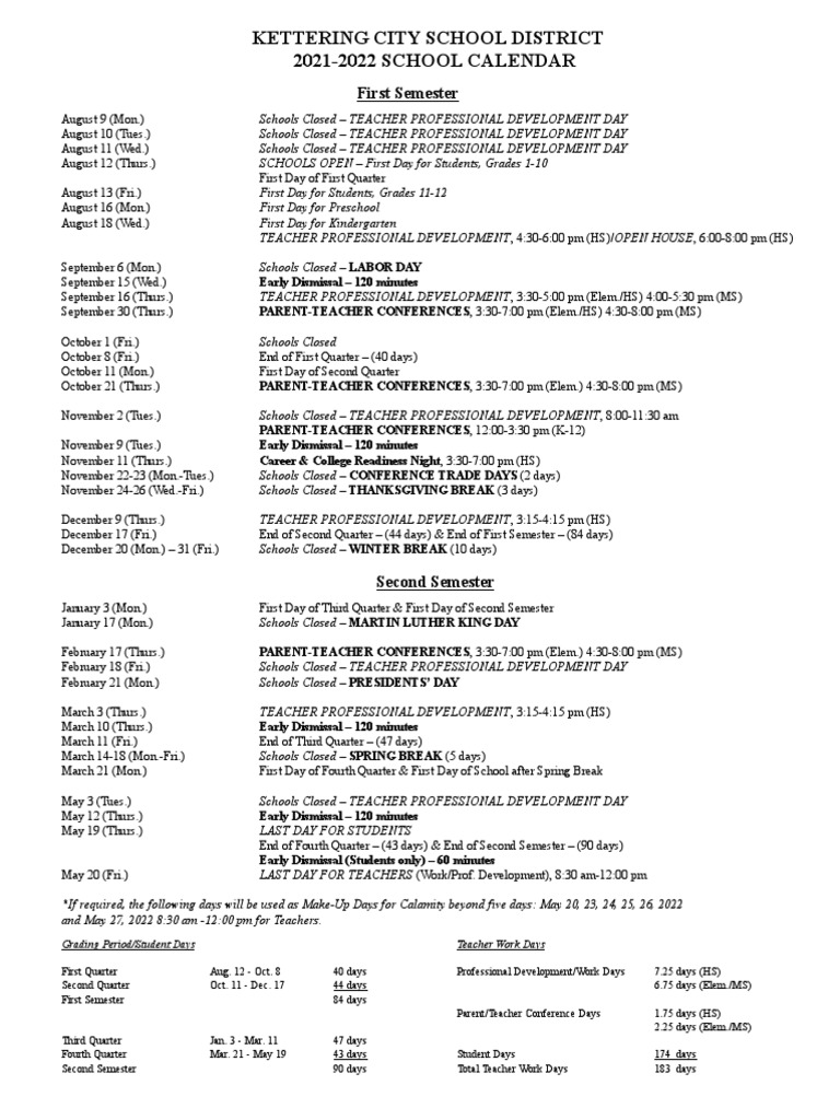 Kettering City School District 2021 2022 School Calendar: A