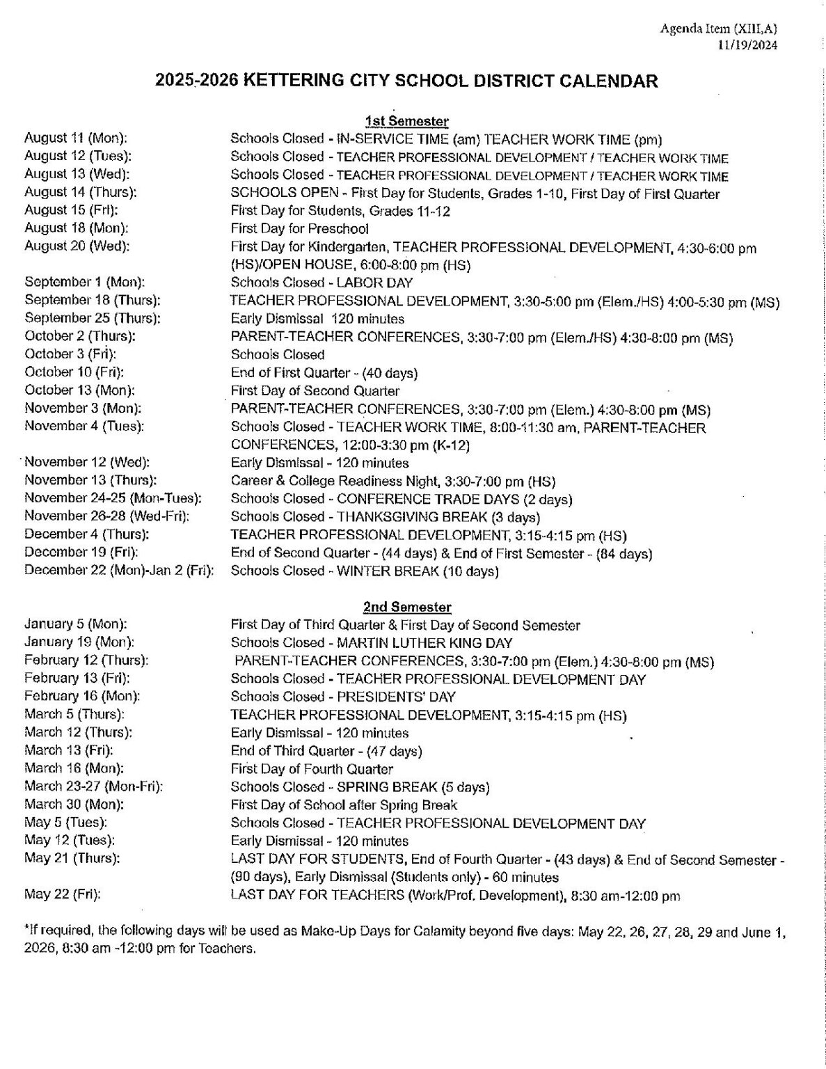 Kettering City School District Calendar 2025 2026 in PDF School