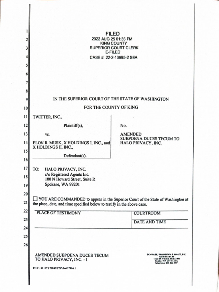 Twitter vs Musk Halo Privacy Subpoena King County Superior Court PDF