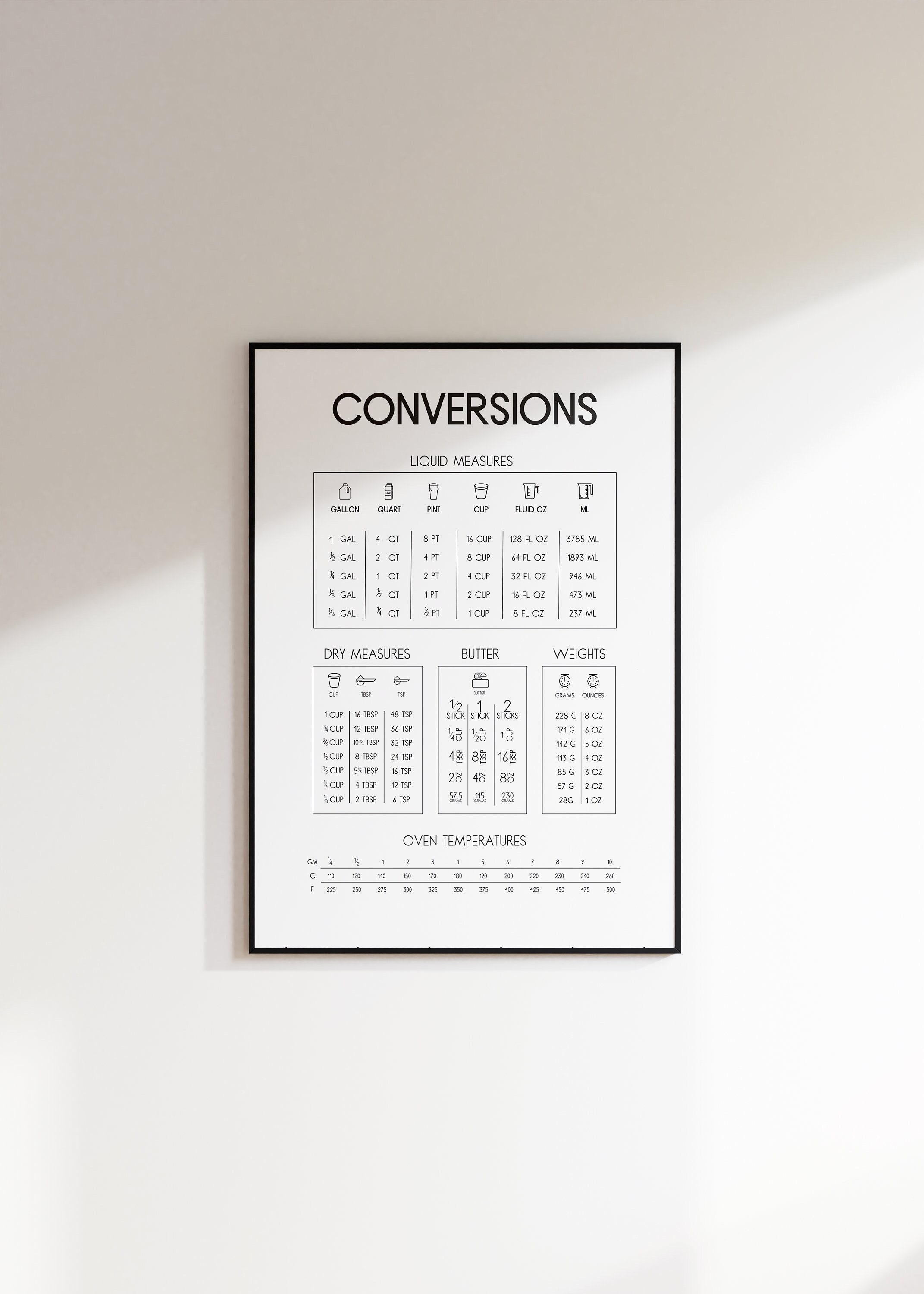 Cooking and Baking Kitchen Conversion Printable Stylish Wall Chart