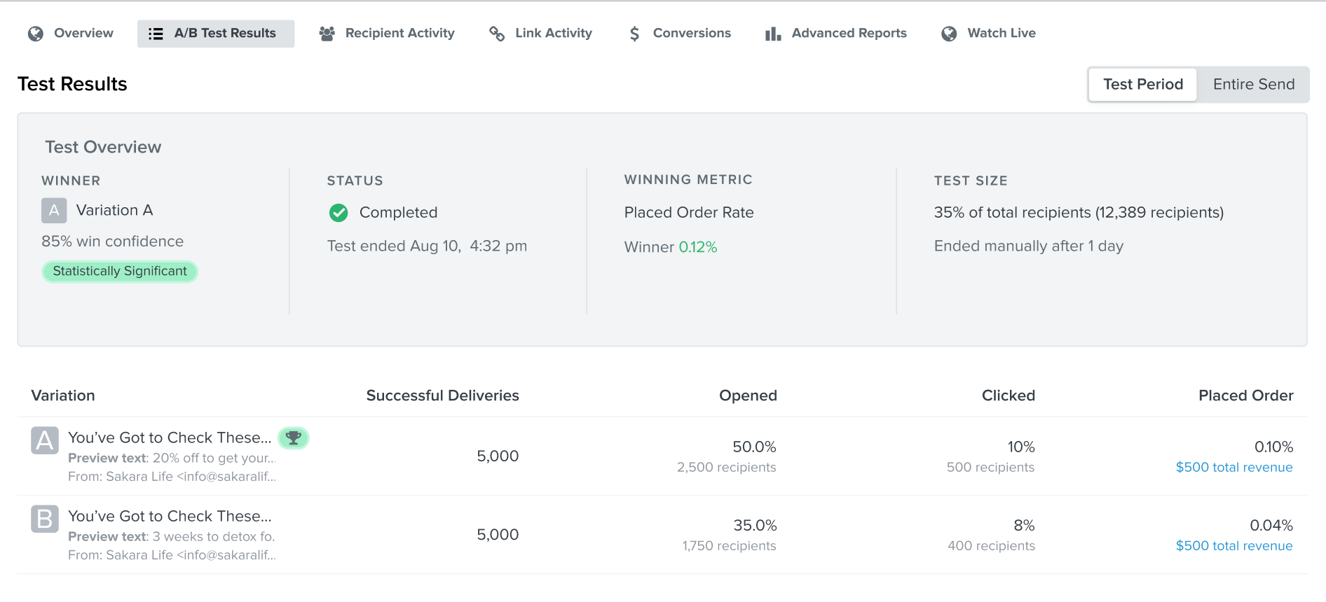 A/B test for purchase rate Klaviyo Product Features