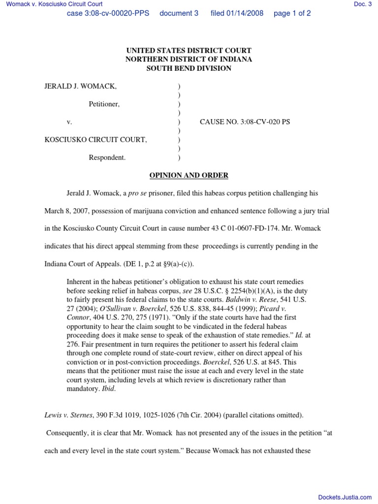 Womack v Kosciusko Circuit Court Document No 3 State Court