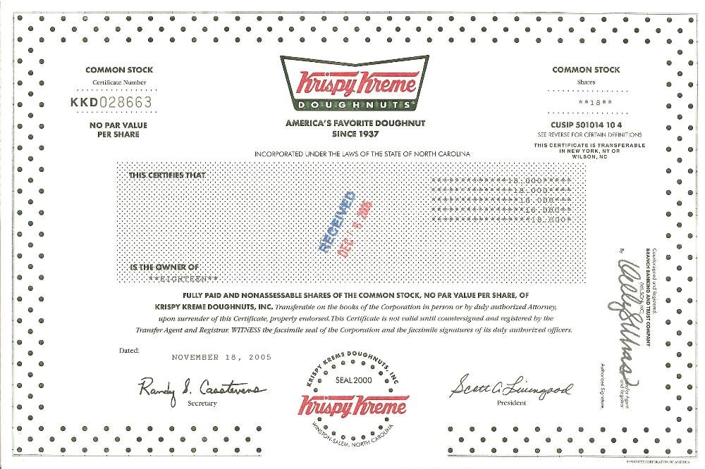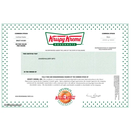 Krispy Kreme Personalized Replica Stock Certificate