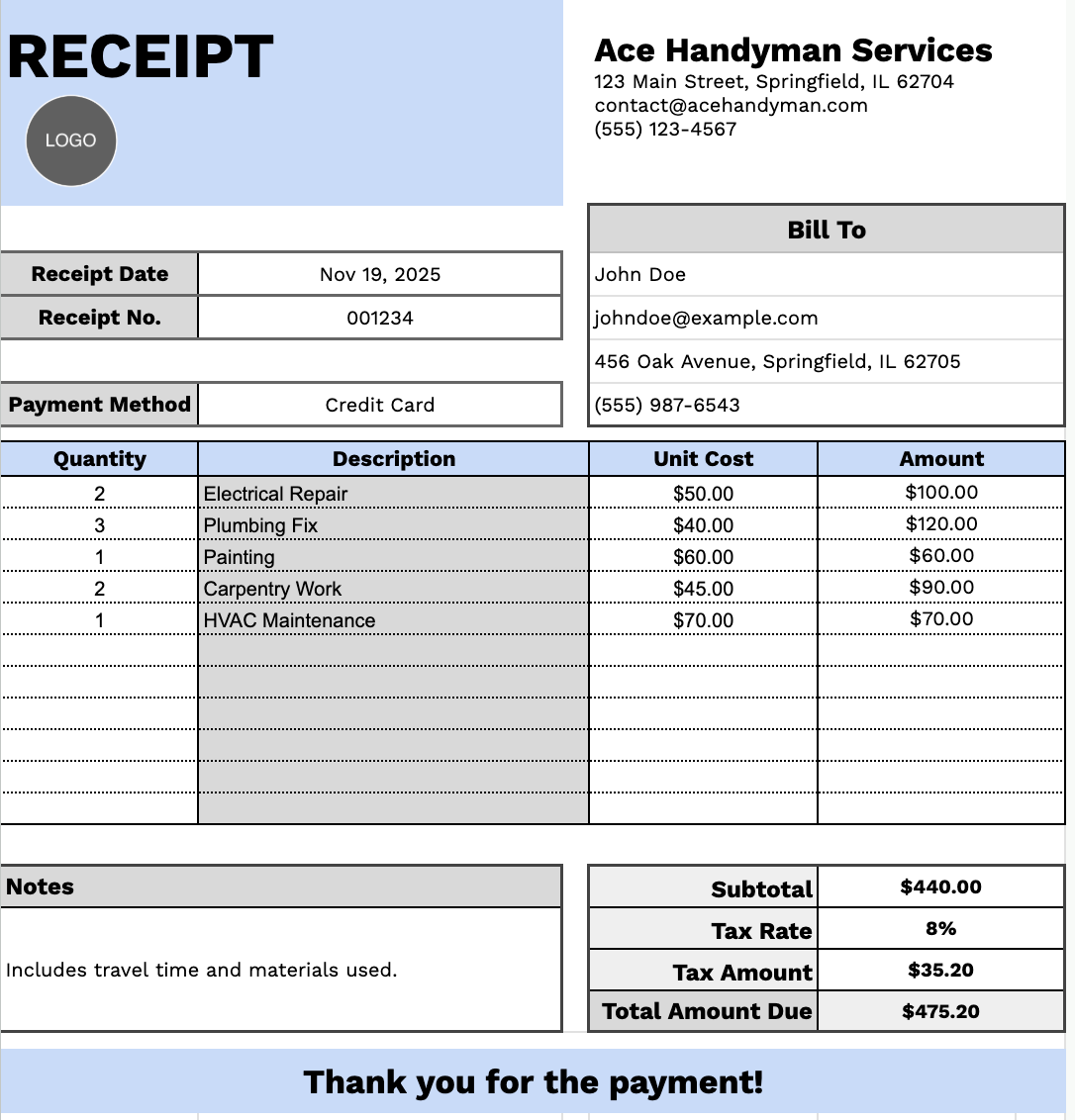 Free☝️ Labor Receipt Template (Google Sheets Excel Word Google Docs