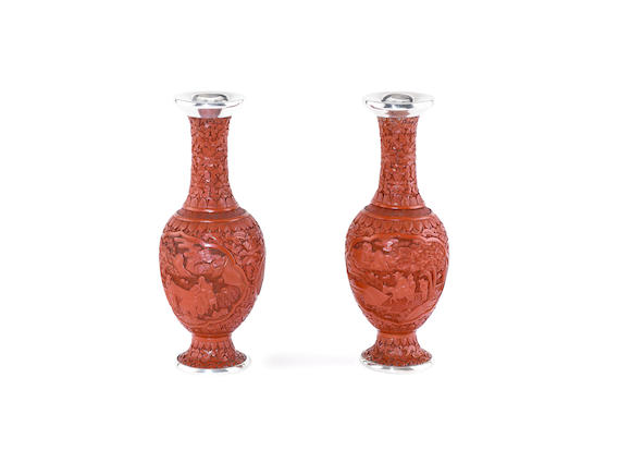 Bonhams : A pair of metalware mounted cinnabar red lacquered style
