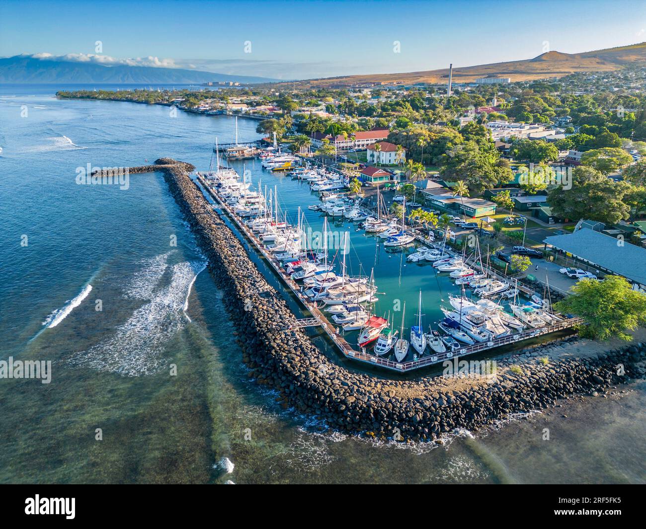 An aerial view of Lahaina harbor and town including the Pioneer Inn