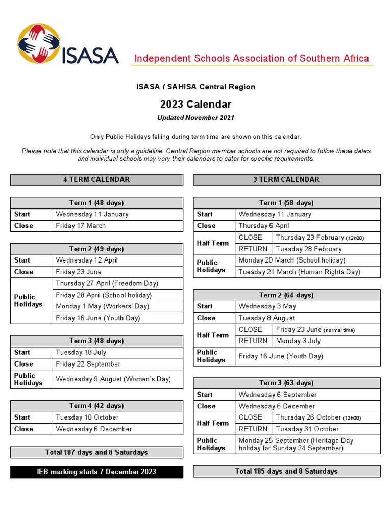 ISASA and SAHISA Central Region Calendar 2023 PDF Academic Term
