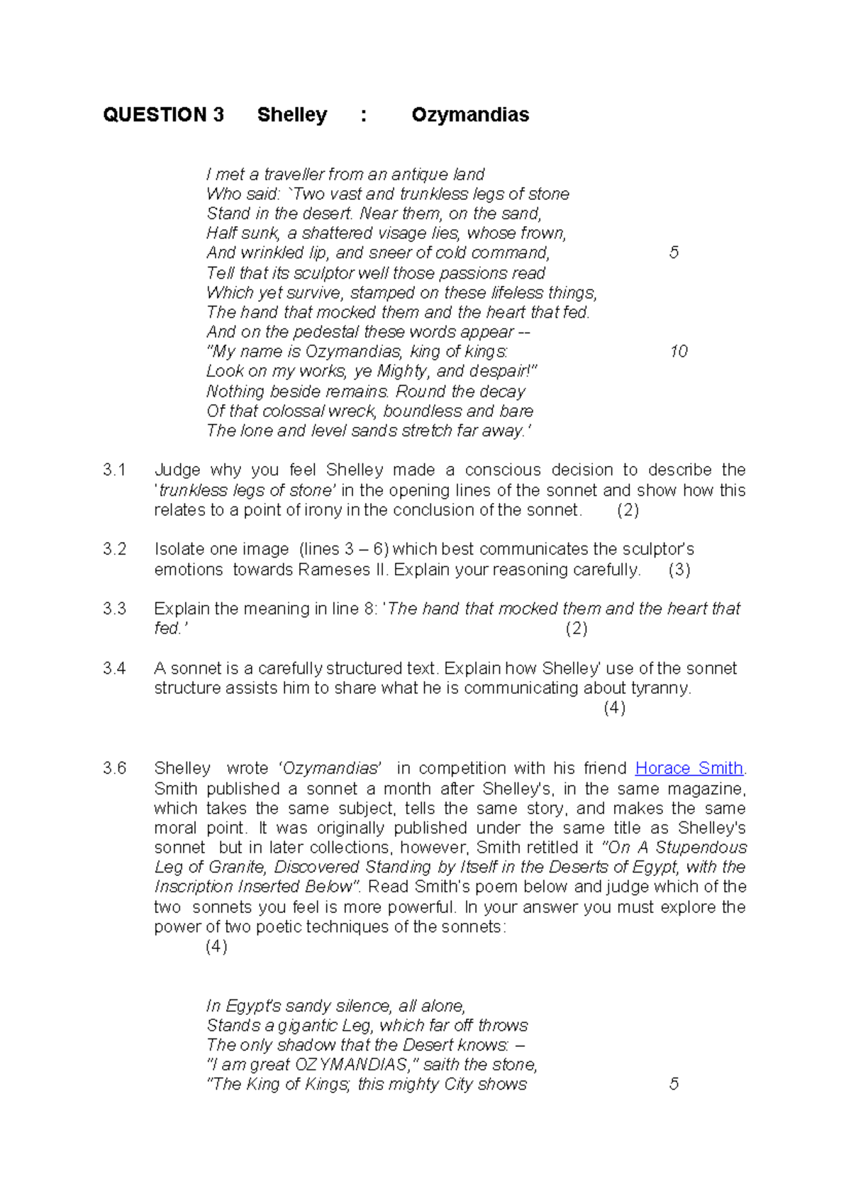 Ozymandias random QUESTION 3 Shelley : Ozymandias I met a traveller