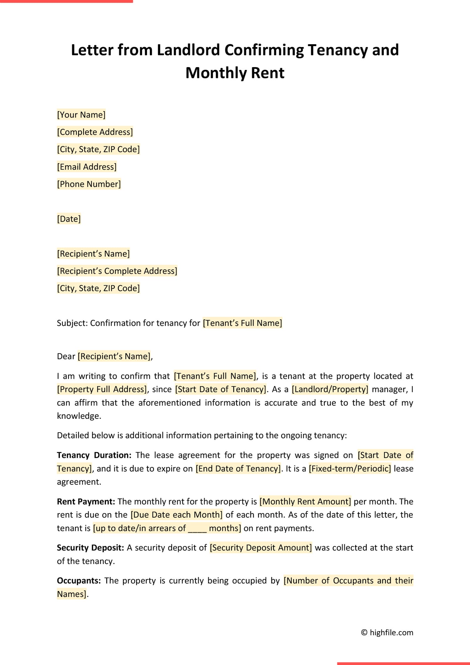 Letter from Landlord Confirming Tenancy and Monthly Rent Highfile