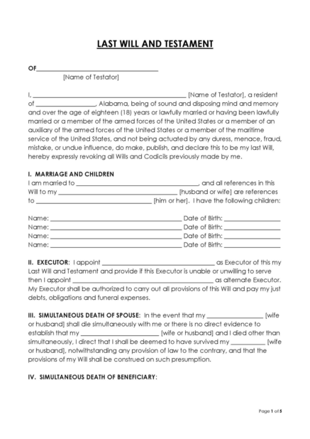 Alabama Last Will and Testament Templates (Free) Word PDF ODT