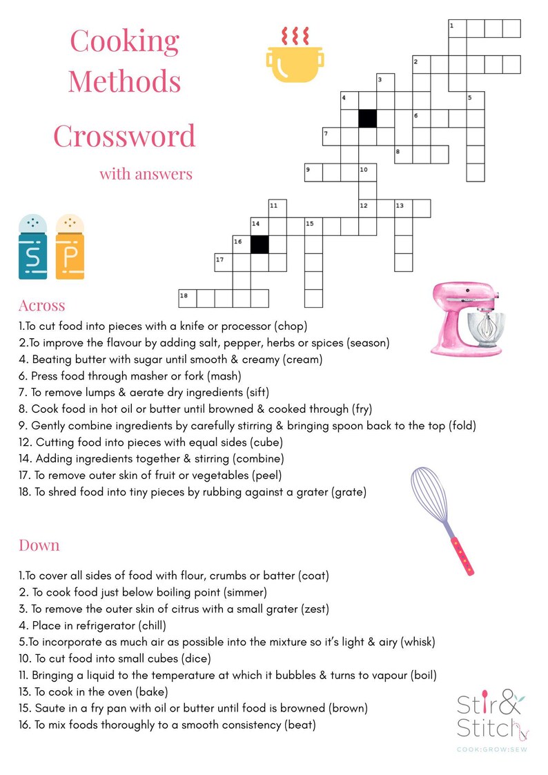 Cooking Crossword DIGITAL FILE Teacher Resource Home Economics