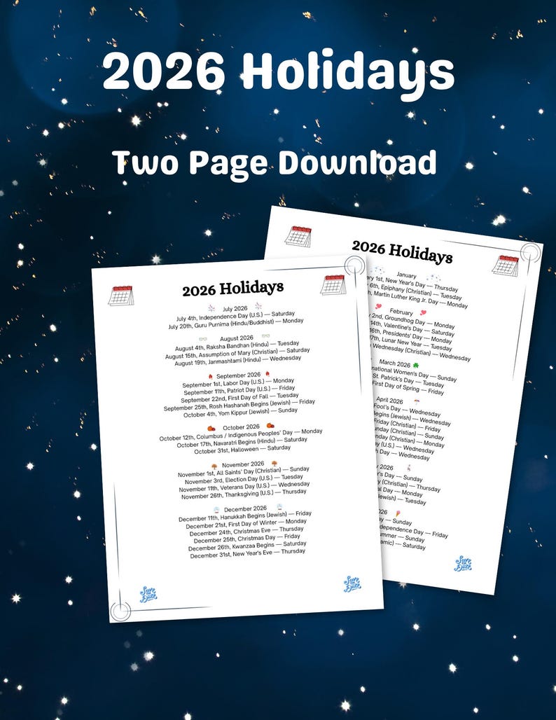 2026 Holiday Calendar Printable: US National Holidays (digital Download