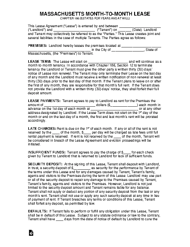 Free Massachusetts Month to Month (Tenancy at Will) Lease Agreements