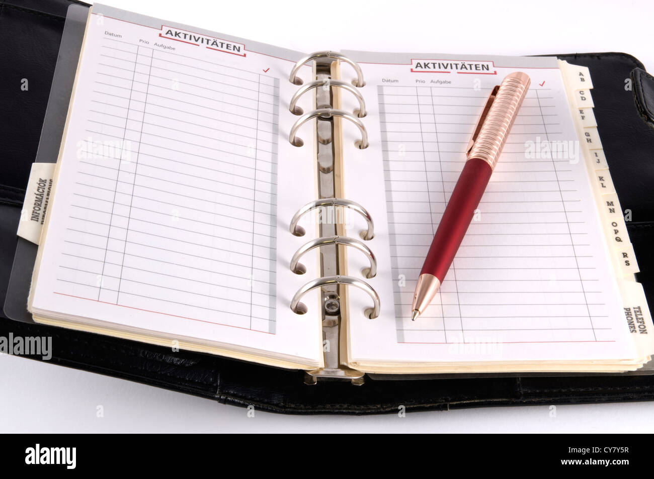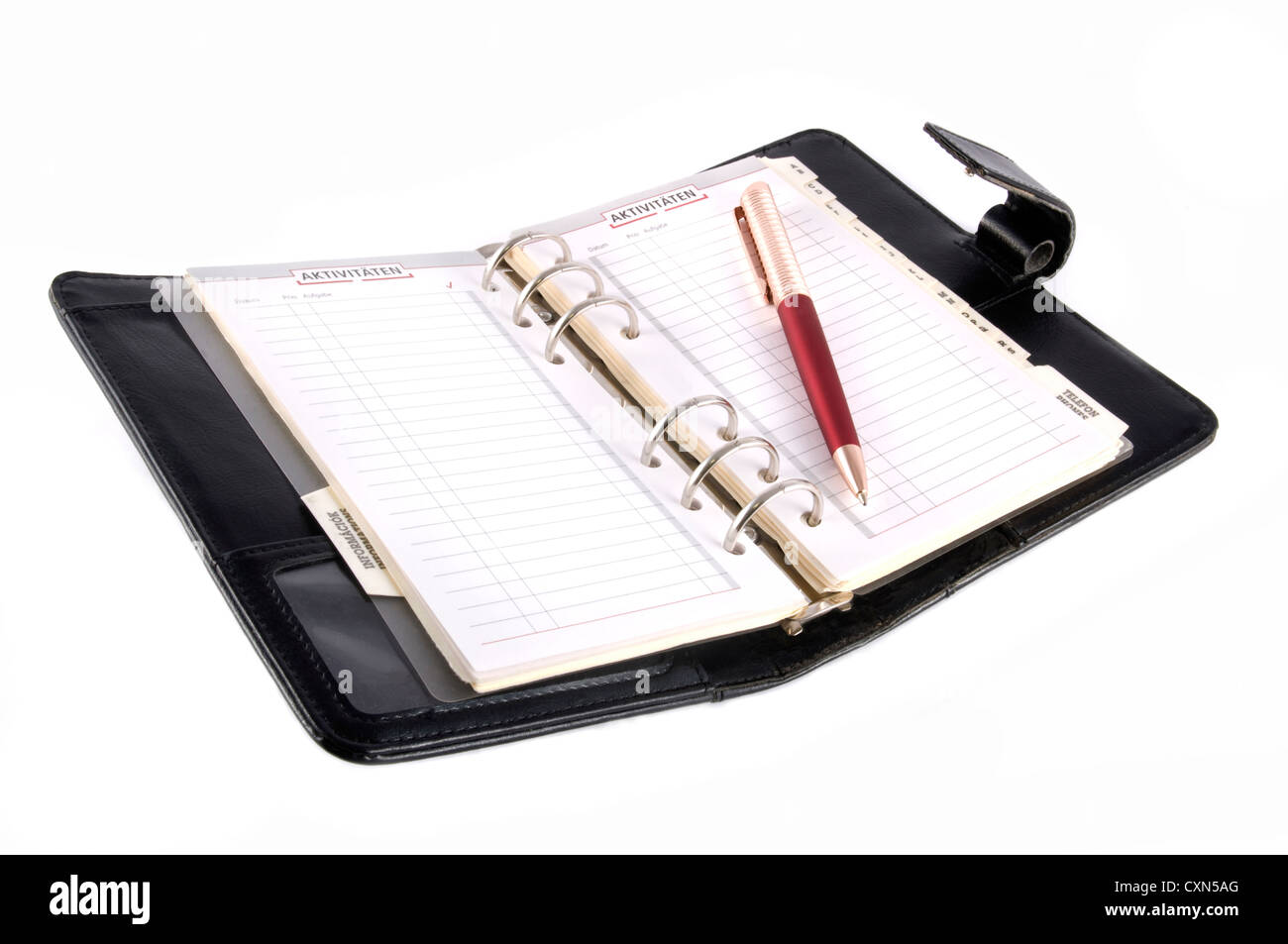 Black leather desk calendar with pen isolated on white Stock Photo Alamy
