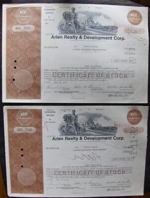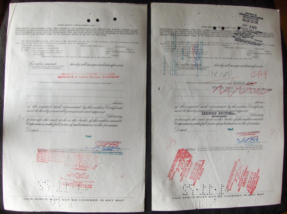 Arlen Realty Development Corp stock certificate Payee LEHMAN