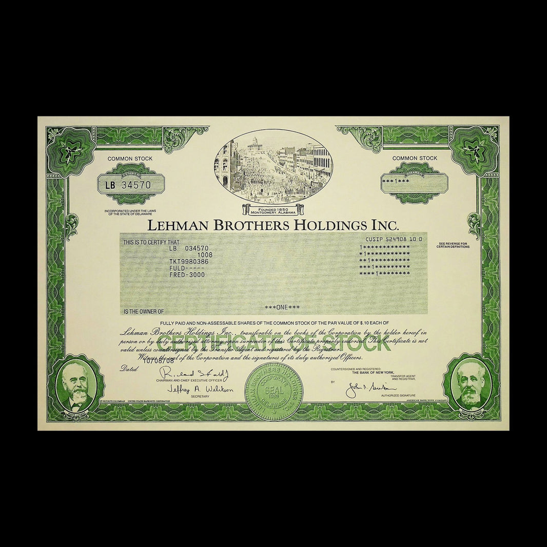 Lehman Brothers stock certificate 2008 Original Authentic Genuine crash