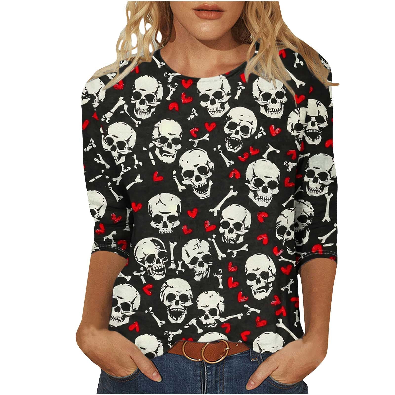 FAVIPT Womens Halloween Tops Funny Graphic Print Basic Tees 3/4 Length