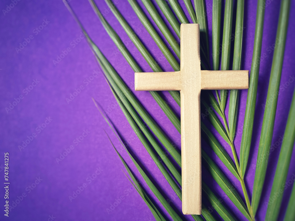 Lent season Holy week and Good friday concept Palm leave and cross on