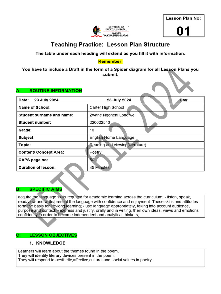 Lesson Plan Template English Edtp 612 2024 PDF Lesson Plan Poetry
