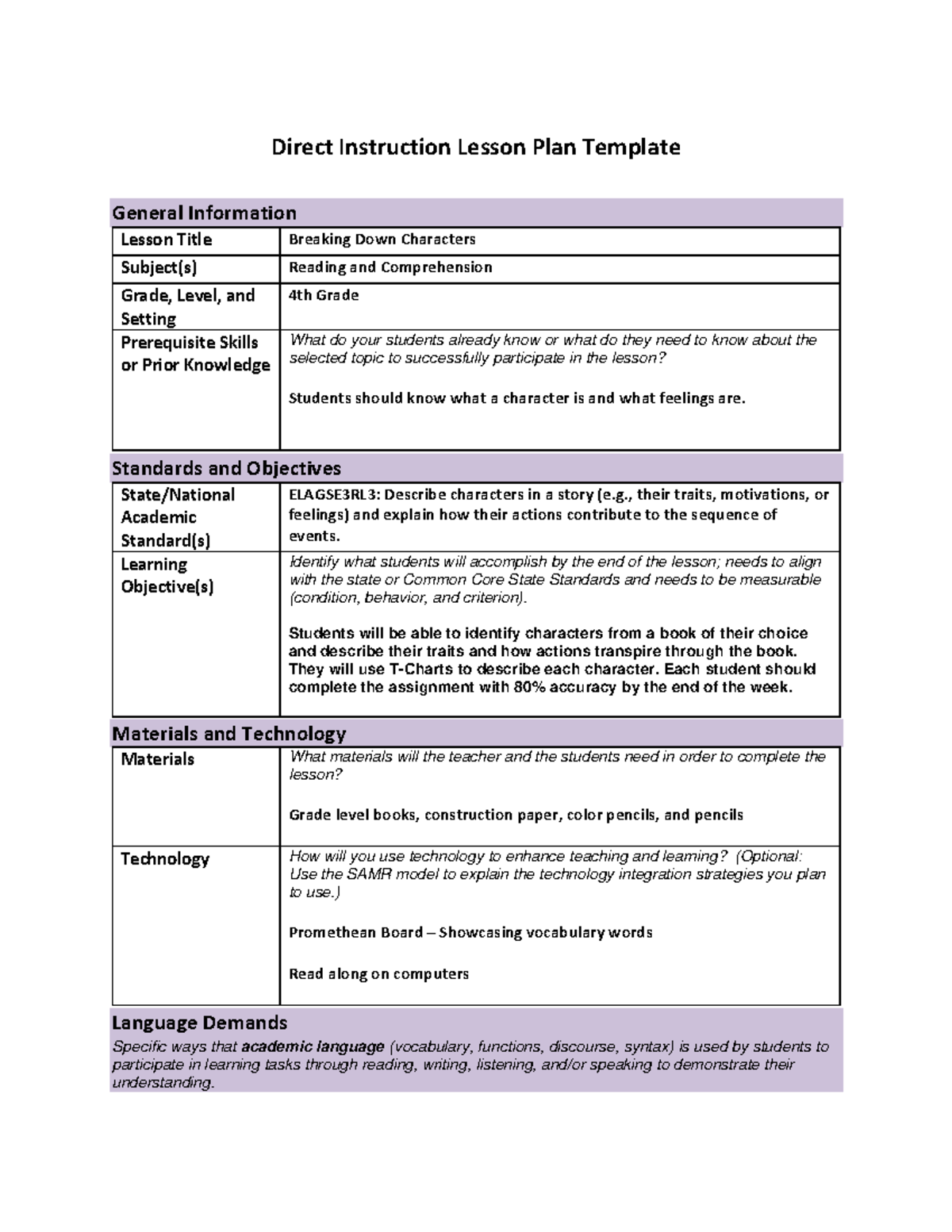 Direct Instruction Lesson Plan Template Standards and Objectives