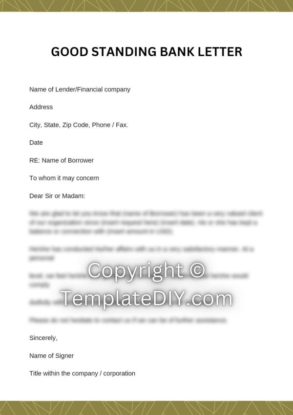 Download Bank Letter of Good Standing Template Editable