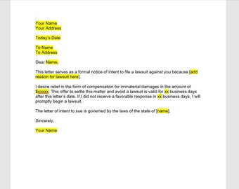 Letter of Intent to Sue (with Settlement Demand) Template Word PDF