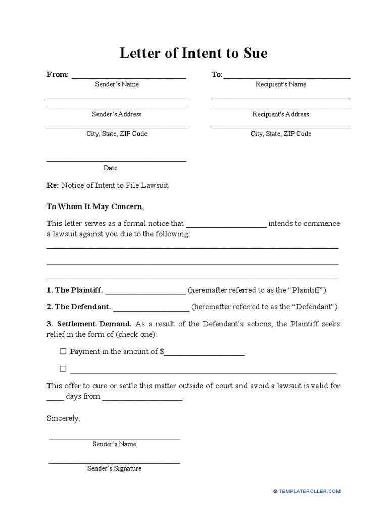 Free Letter of Intent to Sue Template ️ Fillable PDF Form