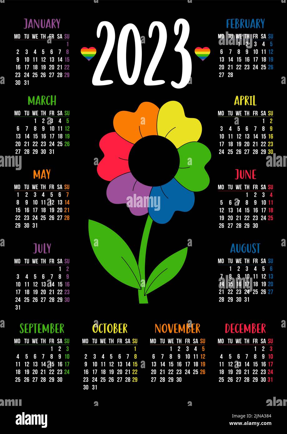 Calendar for 2023 with LGBTQ Symbol flower with rainbow petals LGBT