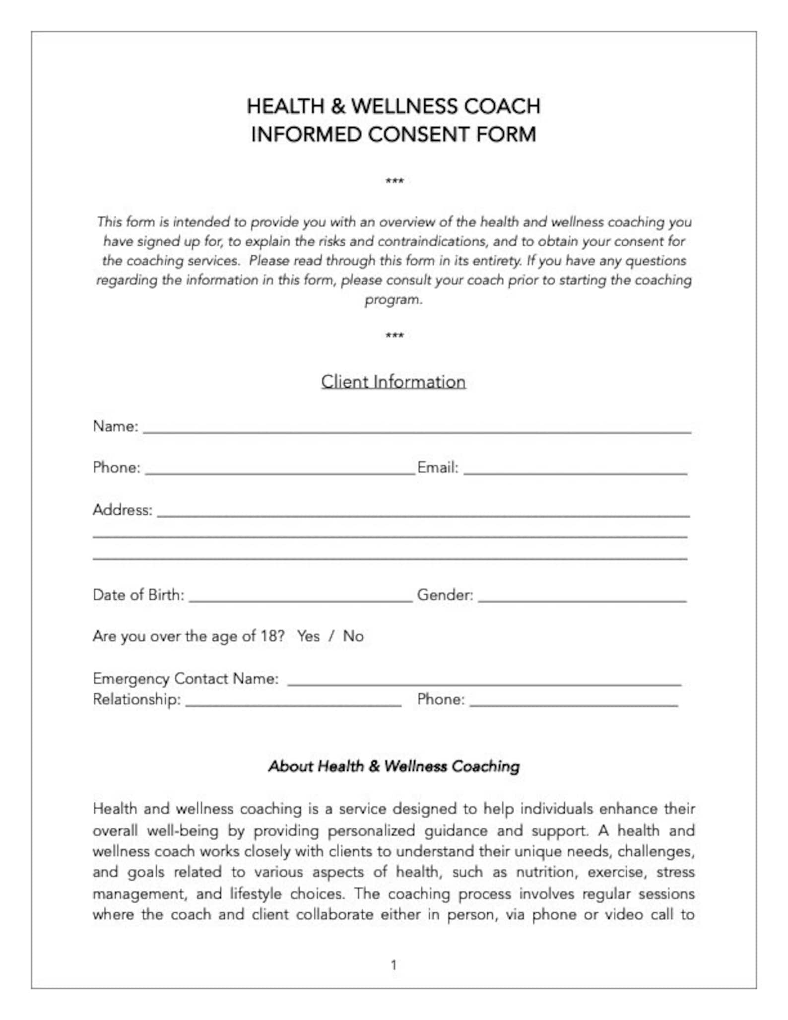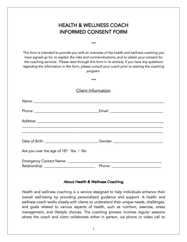 Health Coach Consent Form Wellness Coaching Informed Consent Template