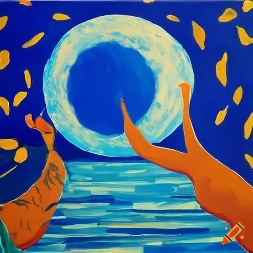 Matisse style painting of a blue moon viewed from a terrace on Craiyon