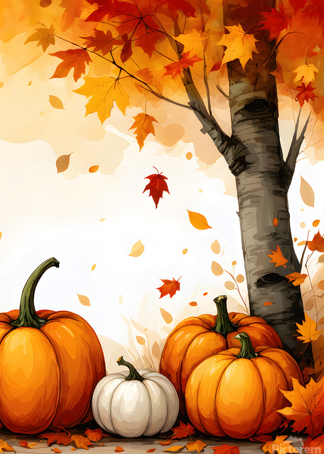 Autumn Pumpkins and Falling Leaves by BasmaDesigns2025 Wall Art